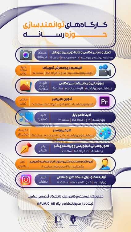 به گزارش باشگاه خبرنگاران دانشگاه فردوسی مشهد؛ کارگاههای توانمندسازی حوزه رسانه با هدف مهارتافزایی و تربیت نیروهای متخصص و فعال در این حوزه در مردادماه ۱۴۰۳ طراحی و اعلام برنامه شد.